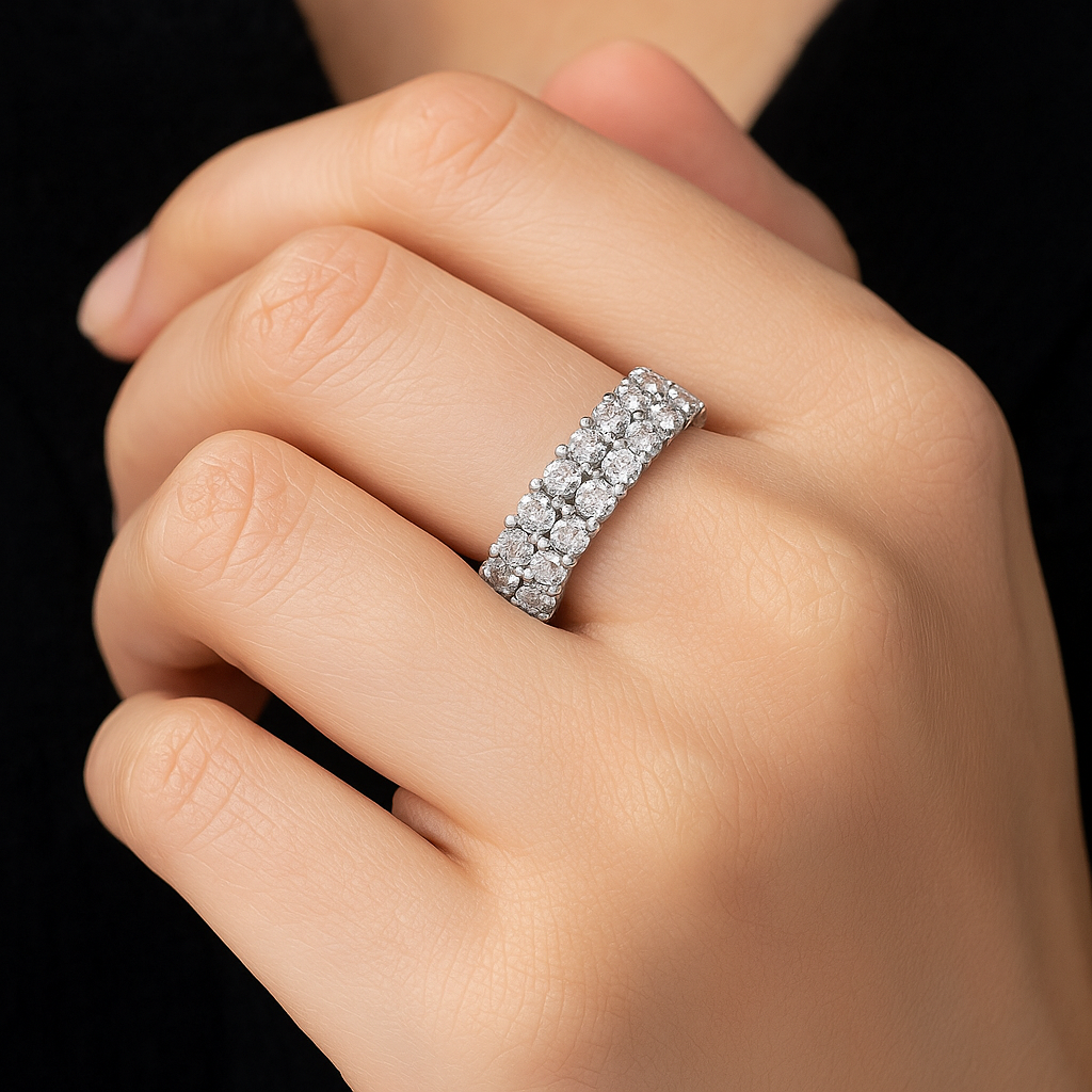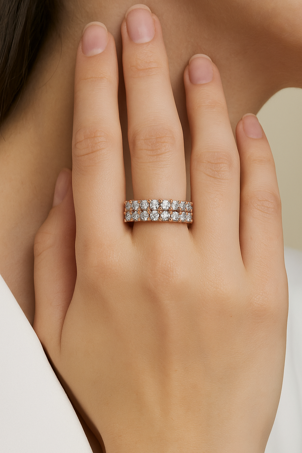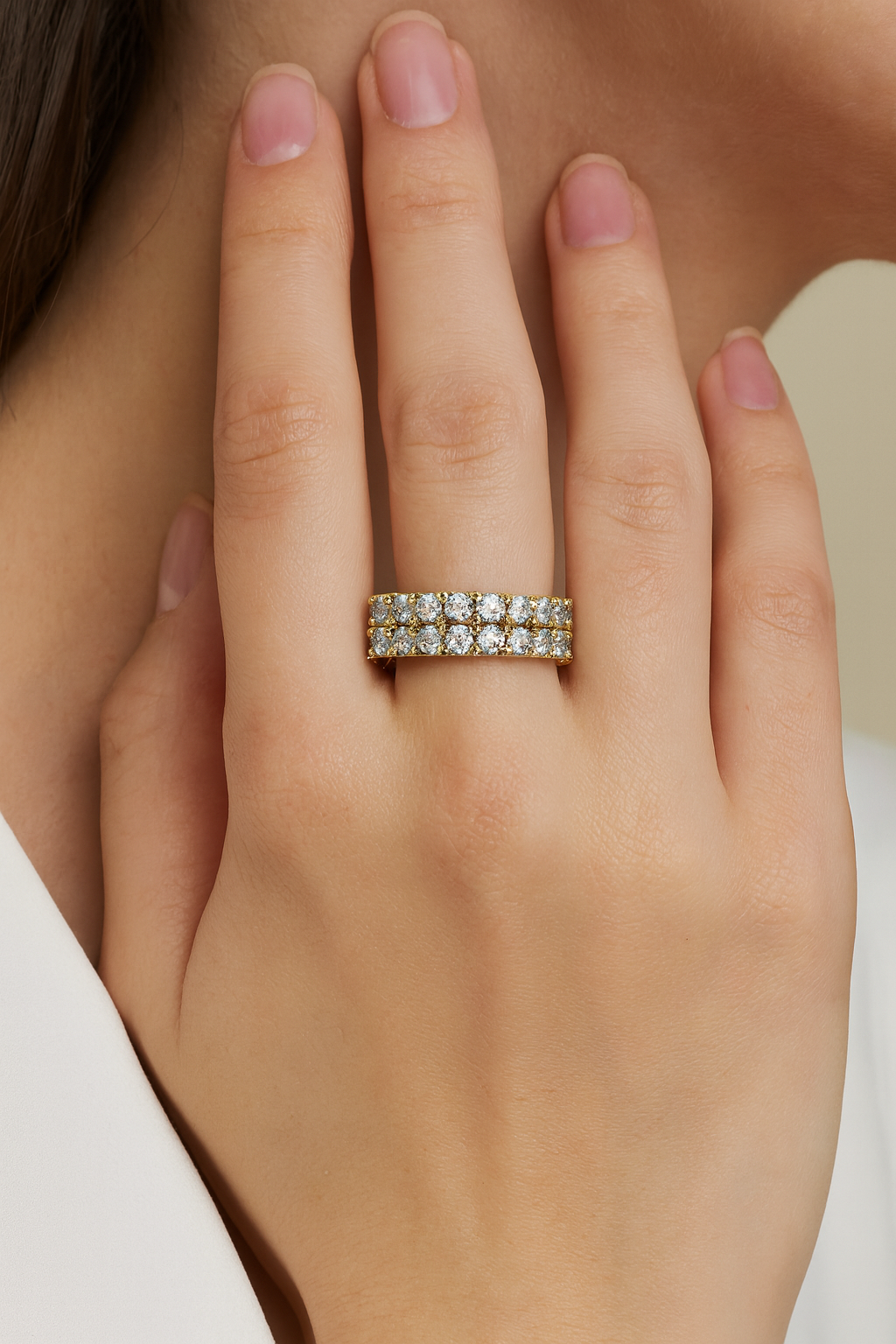 Experience timeless elegance with the Eternelle Duo Diamond Band, featuring two continuous rows of brilliant round-cut diamonds set in lustrous 14k gold. Designed to capture light from every angle, this band radiates sophistication and luxury, making it the perfect statement piece for special occasions or everyday refinement.